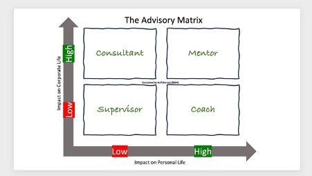 As a final note, here is the advisory matrix that I prepared on the axis of ‘Impact on Personal Life’ and ‘Impact on Corporate Life’. This matrix explains the role of Supervisor, Consultant, Coach, and Mentor in our two-dimensional lives.