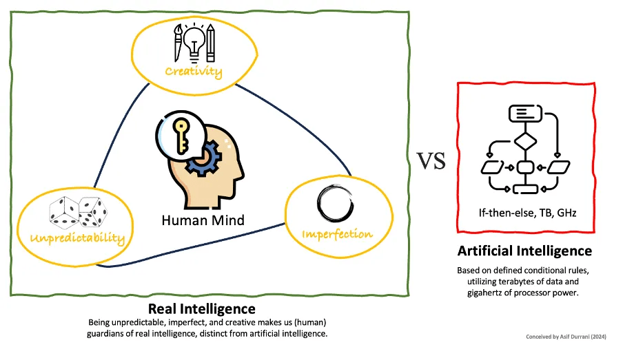 Being unpredictable, imperfect, and creative makes us guardians of real intelligence, distinct from artificial intelligence. If everything in life were perfect and predictable, such as game outcomes or major life decisions, it would lack excitement and suspense. Humans possess true intelligence, marked by creativity, which cannot be matched by the vast data processing capabilities of AI.